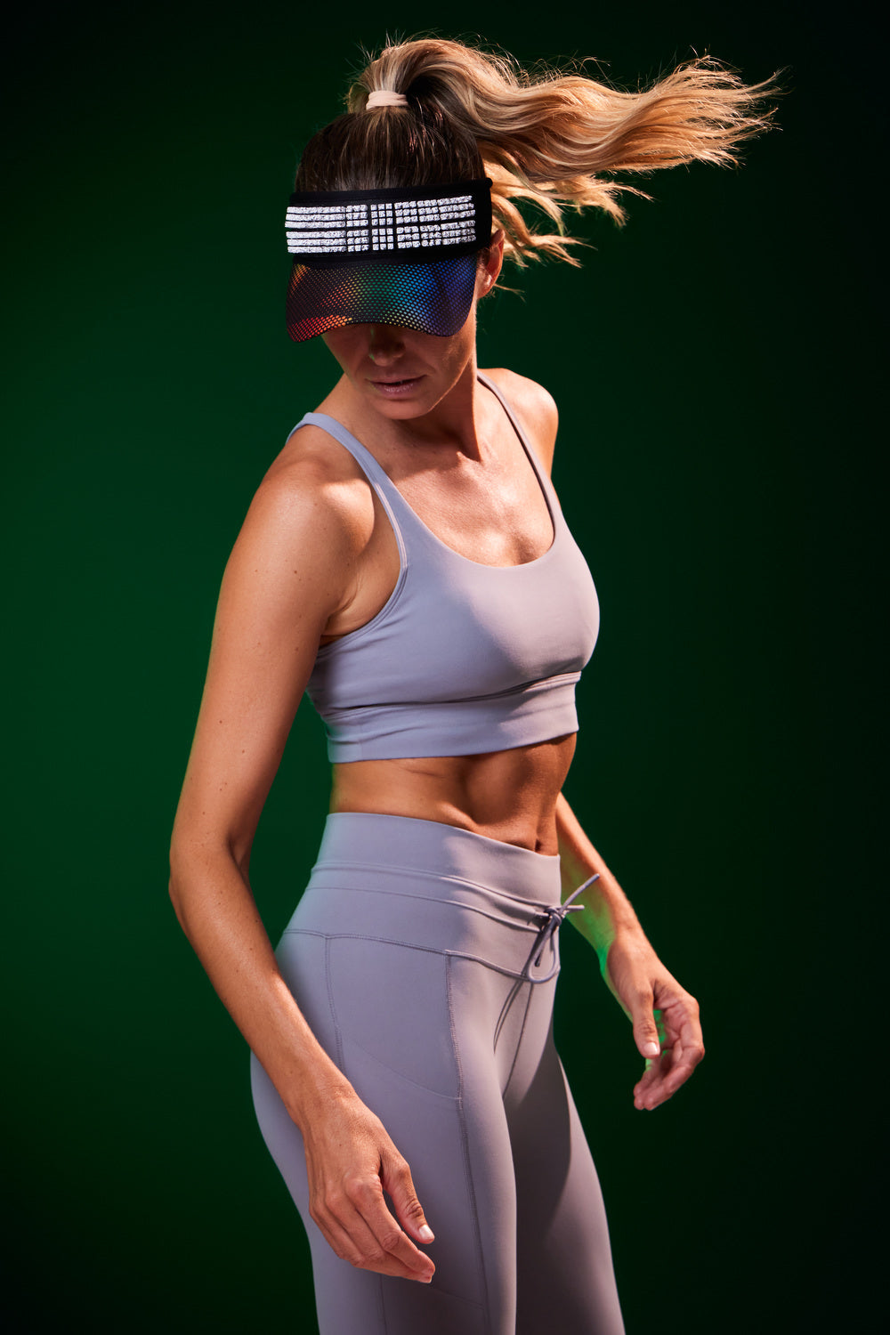 This lightweight and ergonomic running visor features a silicone grid designed to hold our cooling pieces directly against your skin